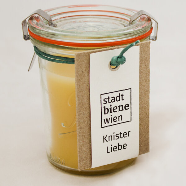 Das Bienenwachs wird in der Wiener Bio-Imkerei von Hand in ein Vintage Rex-Glas gegossen. Das Glas ist mit Deckel, zwei Klammern und einem Dichtungsring: Nach dem Abbrennen das restliche Wachs im Backofen bei ca. 70°C schmelzen. Das flüssige Wachs vorsichtig ausschütten und mit einer Küchenrolle auswischen. Letzte Wachsreste mit fettlöslichem Spülmittel wegwaschen. Jetzt kann das Glas wie ein übliches Weck-Glas ein zweites Leben beginnen. Größe XL